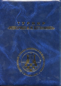 Свидетельство участника турнира Мемориал М. М. Ботвинника (выдано участнику командного шахматного турнира "Мемориал М. М. Ботвинника" среди сильнейших шахматистов Центрального Федерального Округа" 14 - 16 сентября 2001 года в городе Москва). Твердый переплет ( материал бумвинил, золотое тиснение), размер 20,5 х 15 см.